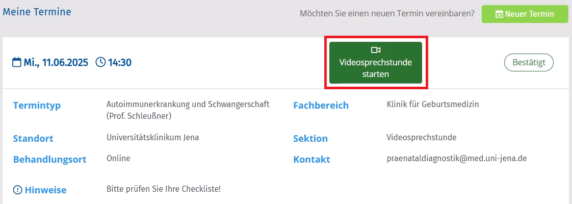 Am Tag der Videosprechstunde erscheint hinter den Termindaten ein Button "Videosprechstunde starten".