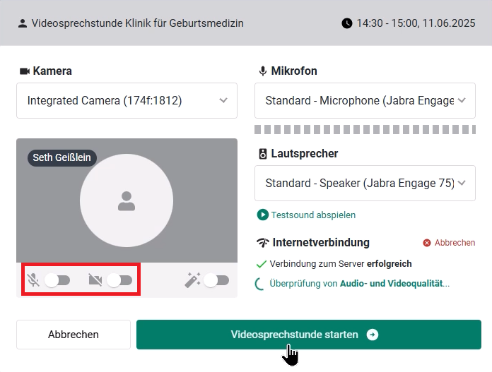 Hinweis: Um die Videosprechstunde zu Beginnen müssen Sie den Bedingungen des Anbieters zustimmen. Auf diese wurden Sie bei der Buchung des Termins bereits hingewiesen.