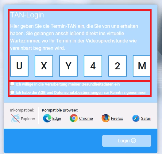 Durch klicken des Buttons werden Sie auf die Seite des Anbieters der Videosprechstunde (polavis.patientus) weitergeleitet. Die 6-stellige TAN wird automatisch ausgefüllt, wenn Sie die Videosprechstunde aus dem Portal starten.